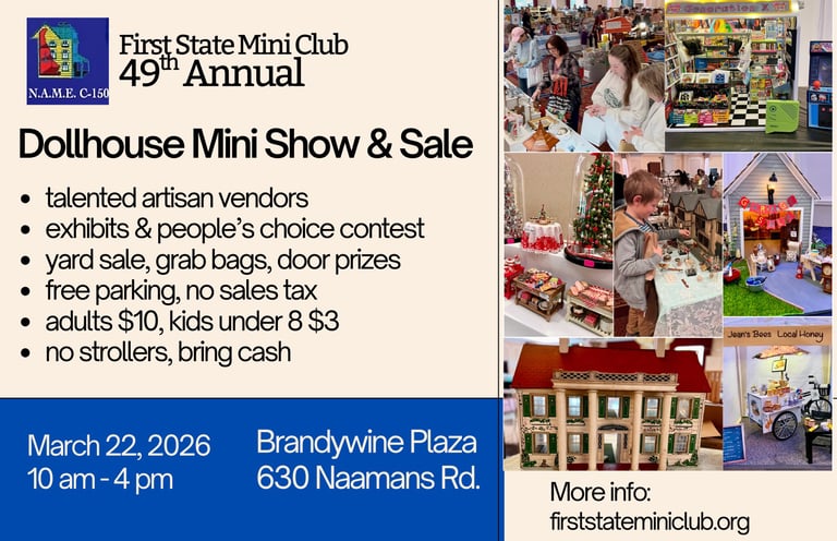 Discover the fascinating world of dollhouse miniatures with the First State Mini Club. Join our community of hobbyists, collectors, builders, artisans, and enthusiasts who share a passion for creating and collecting miniature masterpieces. Stay updated with upcoming events, access valuable resources, and connect with fellow miniaturists. We meet 7-9 PM every third Thursday of the month, except for October which is usually the fourth Thursday, at the New Castle Senior Center. Summer and deep winter meetings are virtual.